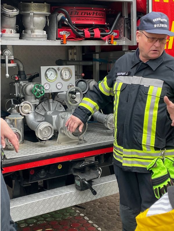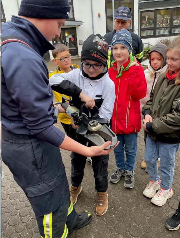 Nachdem die Klasse in zwei Gruppen aufgeteilt war, durfte eine Gruppe auf dem Schulhof das Feuerwehrauto sowie die Geräte auf dem Löschfahrzeug begutachten und "testen" .
