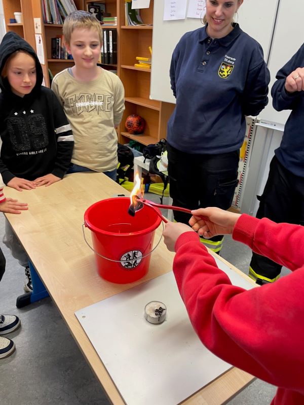 Hier wurde in Rollenspielen das Absetzen eines Notrufes geübt, es wurde die persönliche Schutzausrüstung eines Feuerwehrangehörigen erklärt und die Kinder konnten in praktischen Versuchen sehen, wie sich verschiedene Stoffe von Kleidungsstücken im Kontakt mit Feuer verhalten.