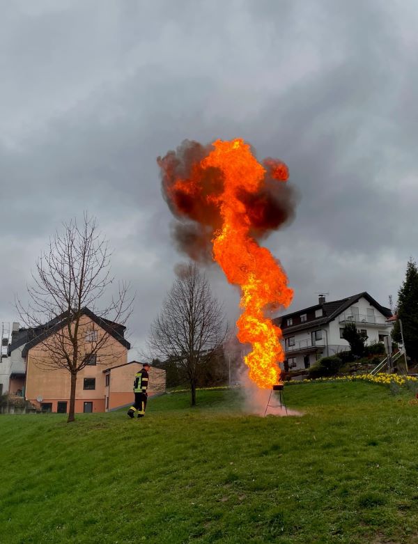 Zur Großen Pause wurde dann wieder, wie jedes Jahr, die Fettexplosion für alle Schülerinnen und Schüler der Grundschule vorgeführt. Hier machten die Kinder große Augen als sie sahen, was passiert, wenn man ca. 150ml Wasser in einen Topf mit brennendem Fett kippt. Bei dieser Vorführung wurde nochmal allen bewusst, wieso man brennendes Fett niemals mit Wasser löschen darf.