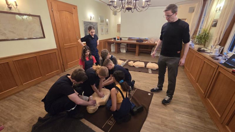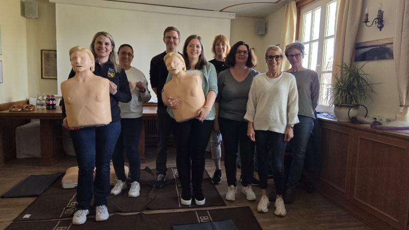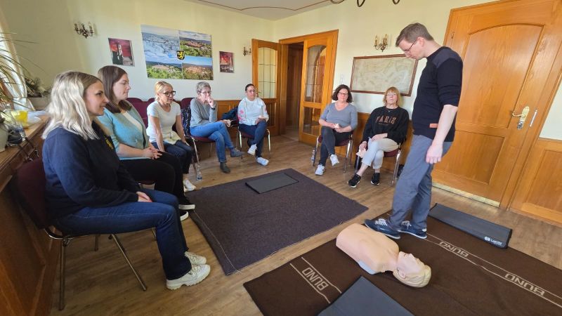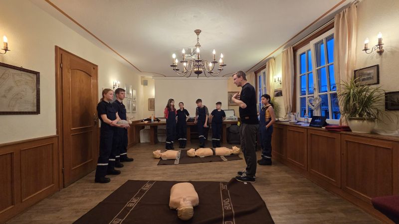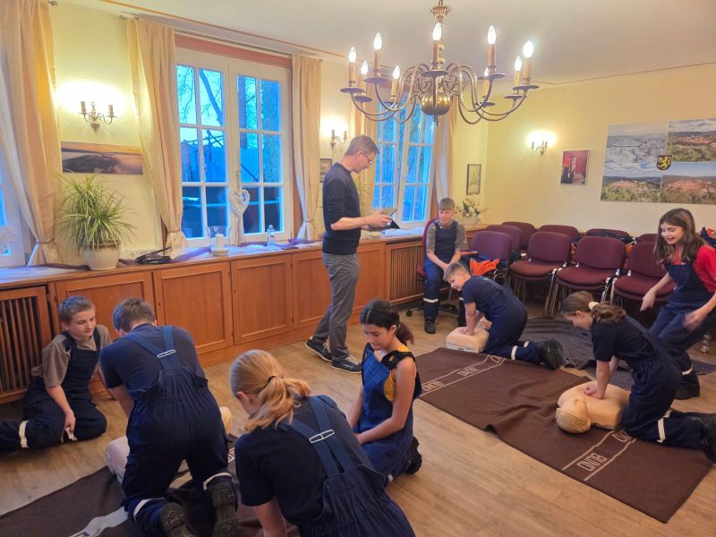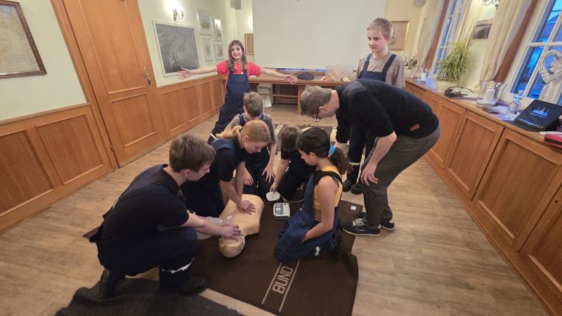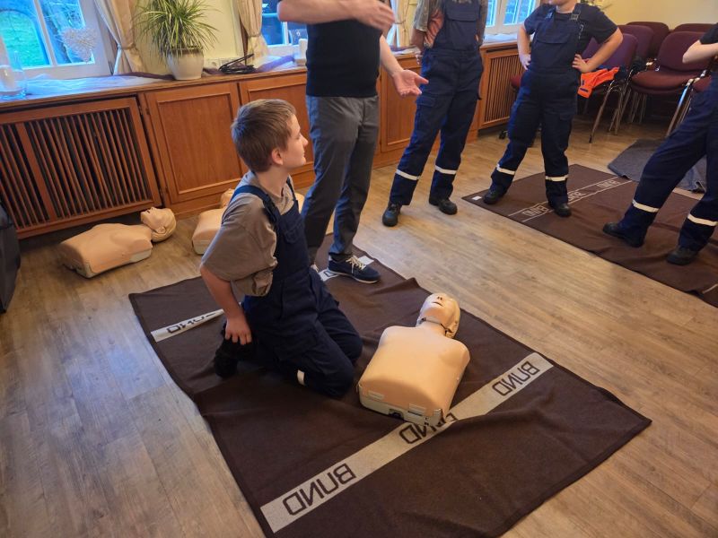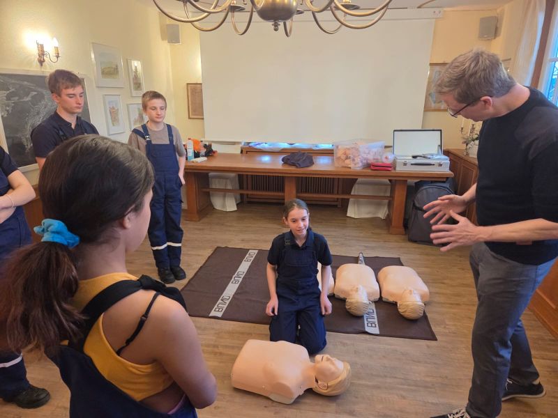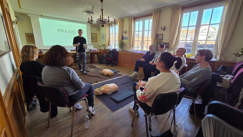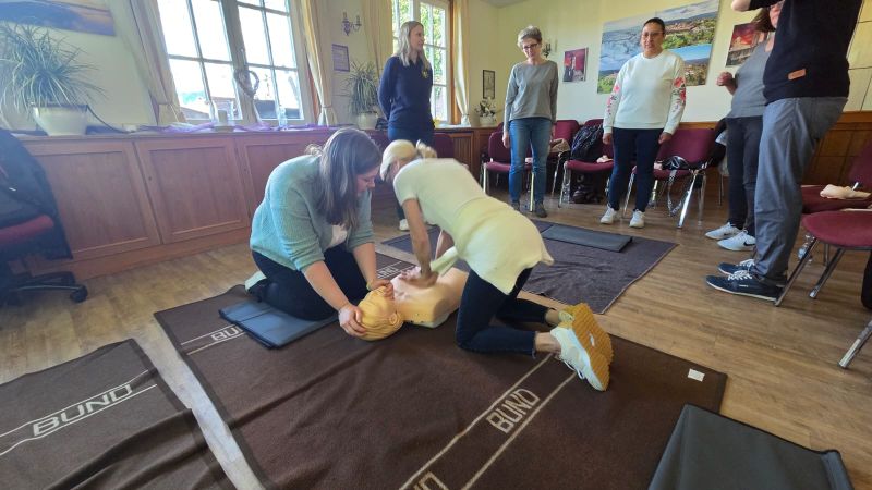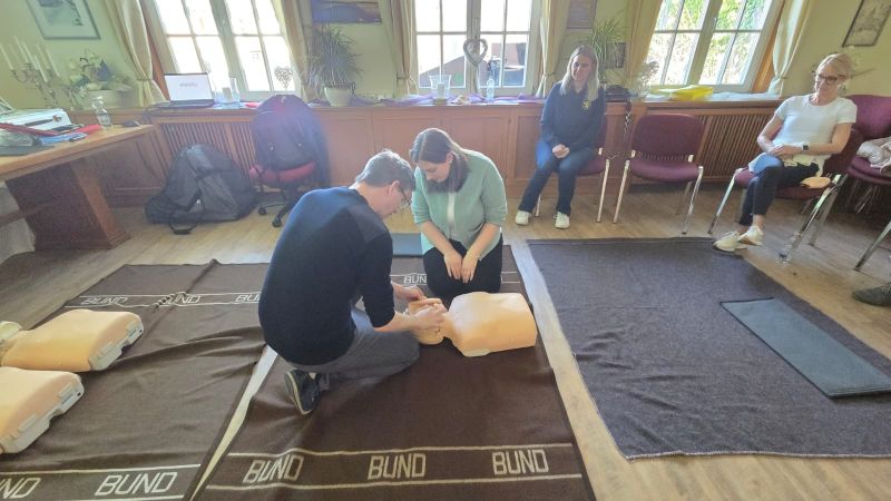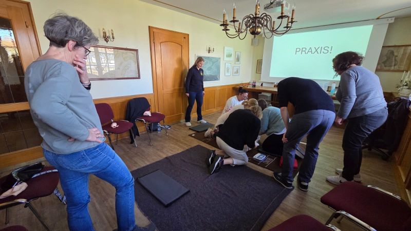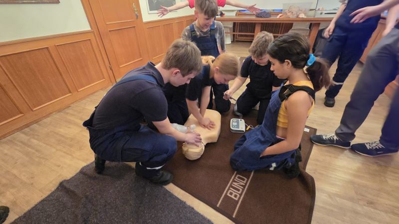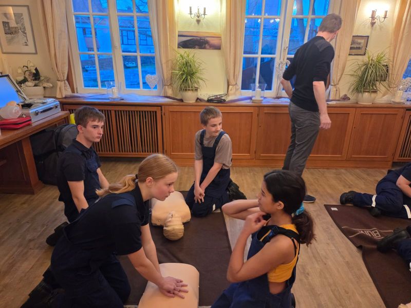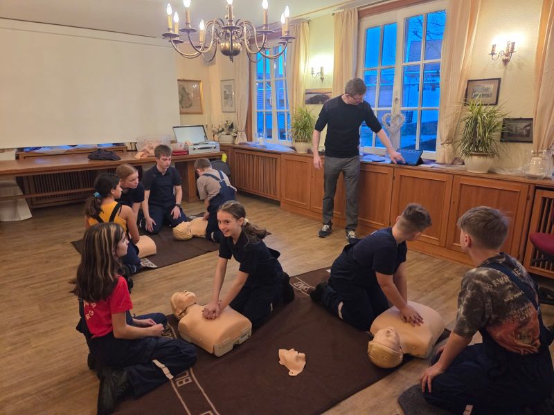 Der Morgen begann mit einer kurzen Theorie über das Absetzen des Notrufes über Erkennen von Herzinfarkt und Schlaganfall bis zu blutenden Haushaltsverletzungen. Danach ging es an den praktischen Teil. Es wurde die Stabile Seitenlage, das Anlegen von Druckverbänden mit Kompressen und Tornique sowie die Reanimation mit und ohne AED (Automatisierter Externer Defibrillator) intensiv geübt. Es war ein interessanter und lehrreicher Vormittag, der allen Spaß gemacht hat.